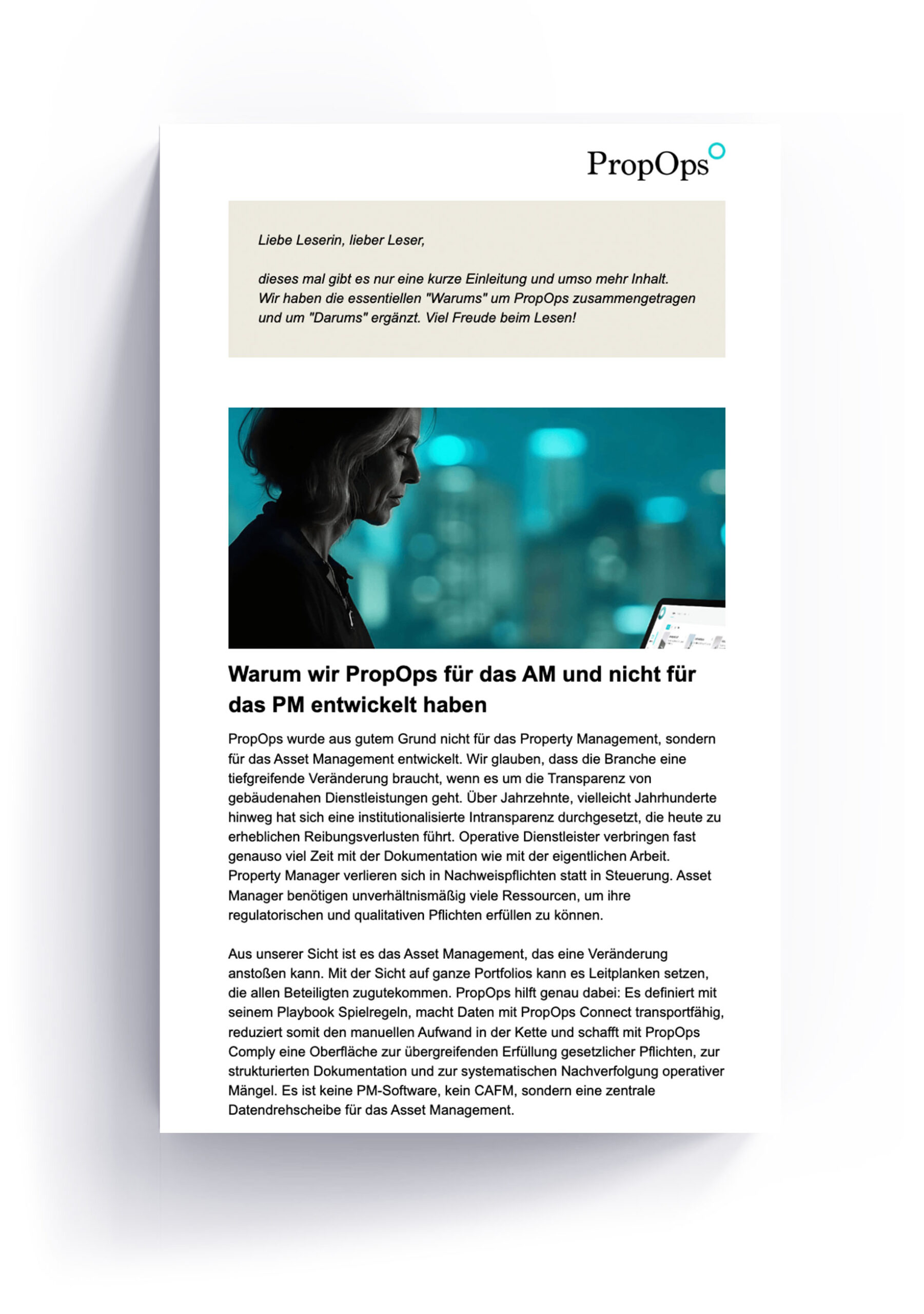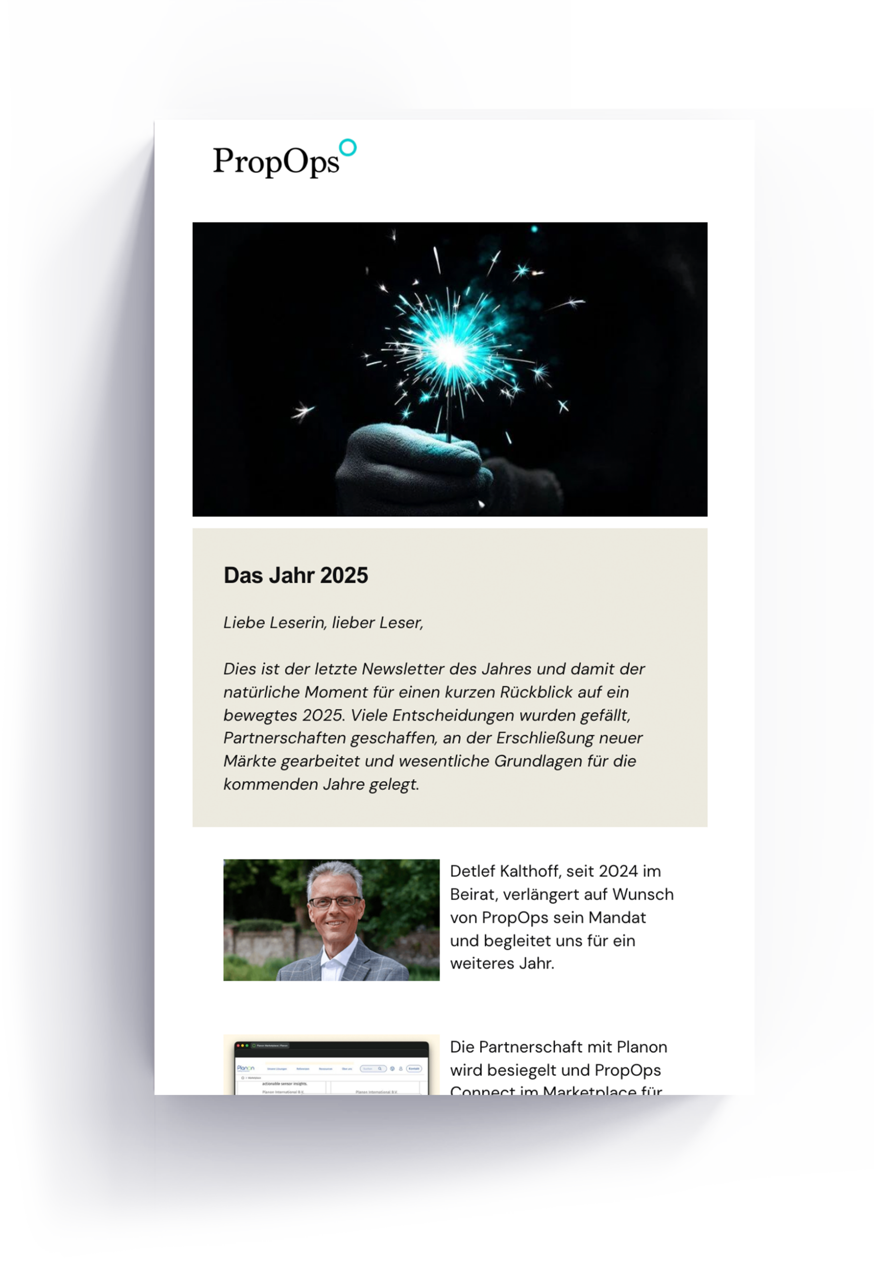 Jeden Monat versenden wir den PropOps-Newsletter an einen ausgewählten Kreis von Kunden, Branchenexperten und Partnern. Hier finden Sie vergangene Ausgaben zum Nachlesen und die Möglichkeit, sich für den Newsletter anzumelden.